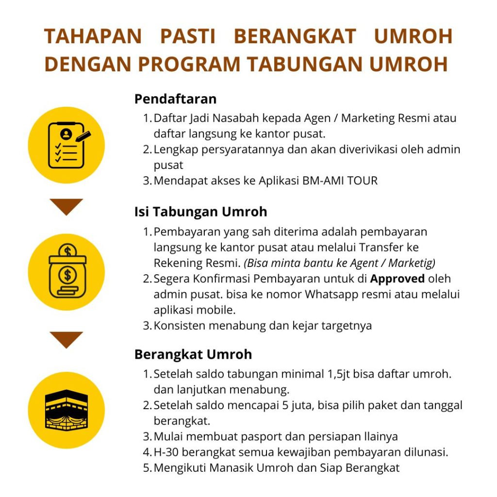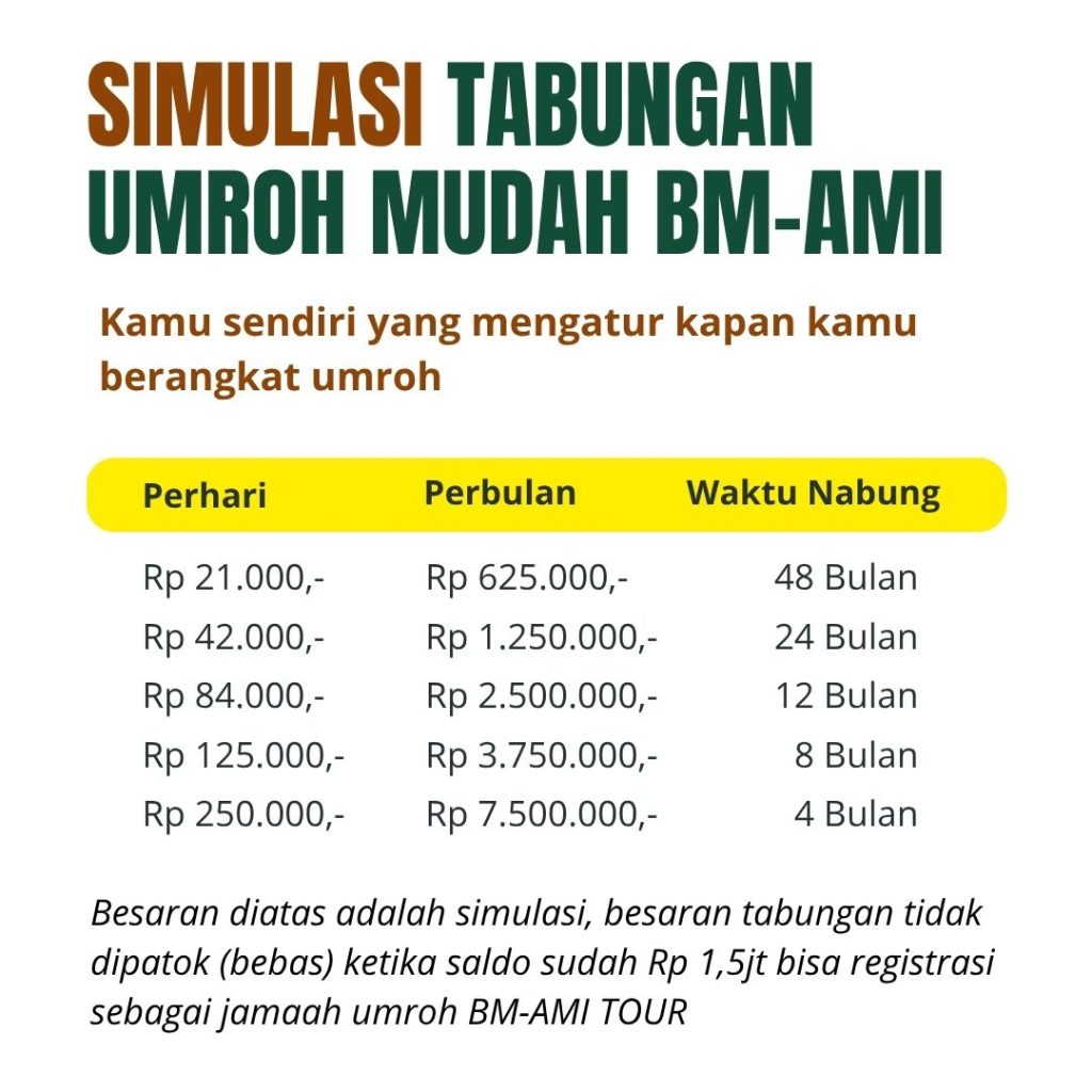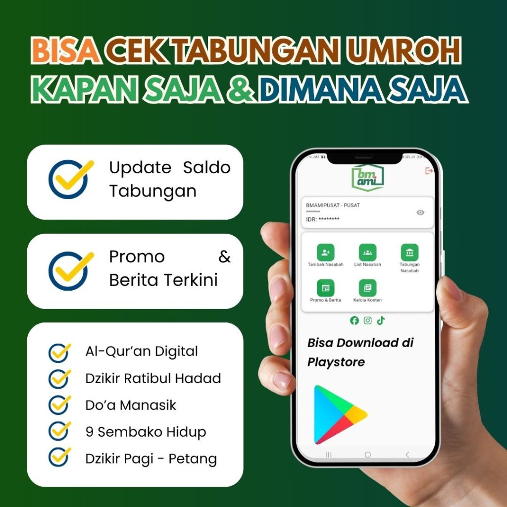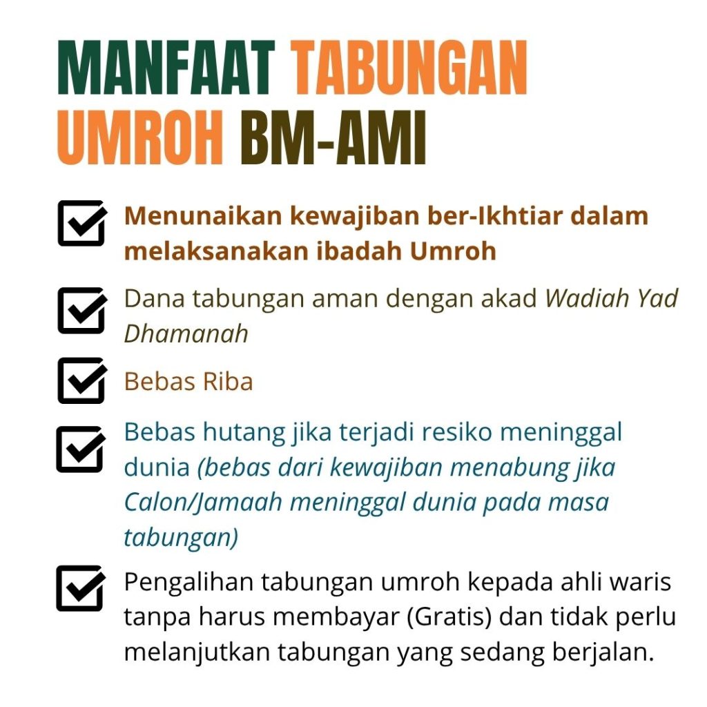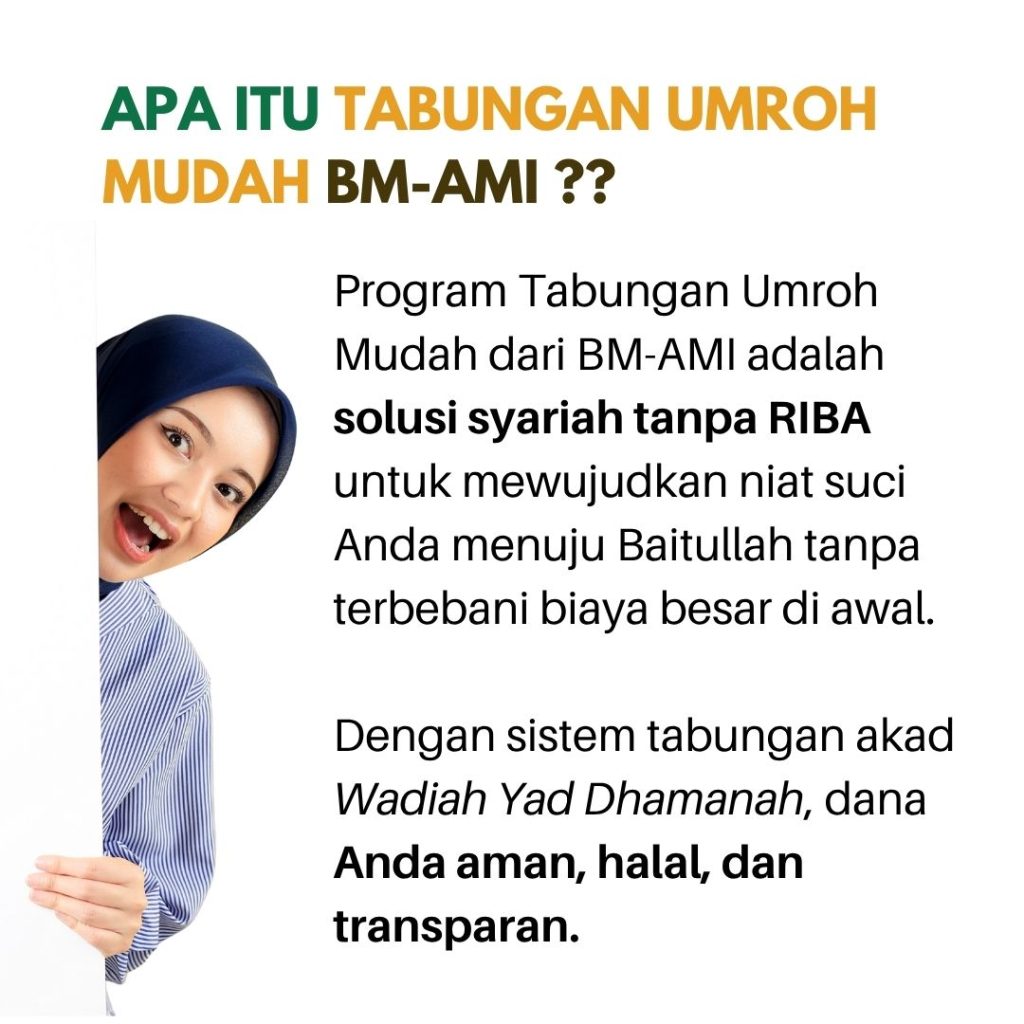 Mulai menabung dari Rp100.000, raih kesempatan berangkat ke Tanah Suci bersama BM-AMI – Baitul Mabrur Al-Madinah Indonesia.